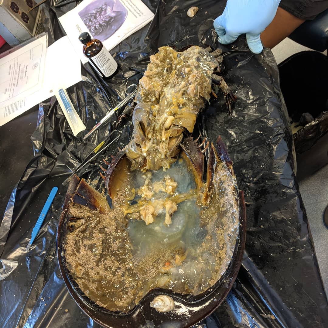 This summer second year Cornell DVM student Nycole Cole worked on a health surveillance study on horseshoe crabs found on Slaughter Beach, Delaware. Despite their regular use for research, we know very little about their normal blood values or bacterial flora (microbiome). A team under the direction of veterinary pathologist Carol Meteyer took photographs, weights, size, recorded lesion descriptions, and collected samples for blood chemistry and blood cell counts. They also searched for sick or injured animals as evidenced by visible lesions or those that seemed stuck (flipped over on their back) for comparison.