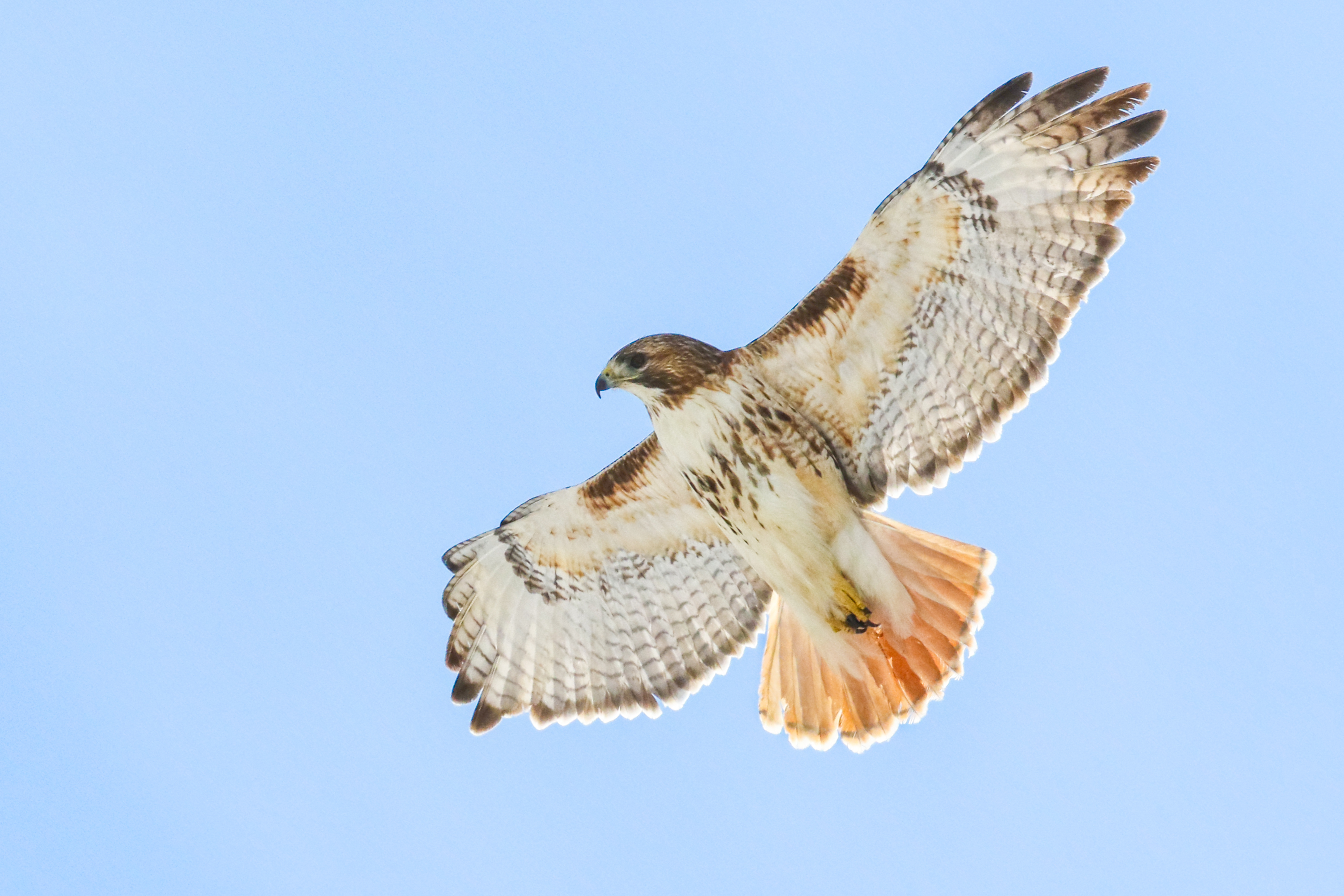 A young Red-Tailed Hawk was brought to a wildlife clinic for treatment. It was identified as a hatching year bird by the brown striped tail. If it is part of the 20% that makes it to the second year, it will molt the striped feathers and acquire the red tail after which it gets its name. This particular bird was very thin and dehydrated, had lice and flies in its feathers, lesions on its eyes, and porcupine quills in its mouth and feet. The veterinarian did not take X-rays, but didn’t feel any broken bones upon palpation.