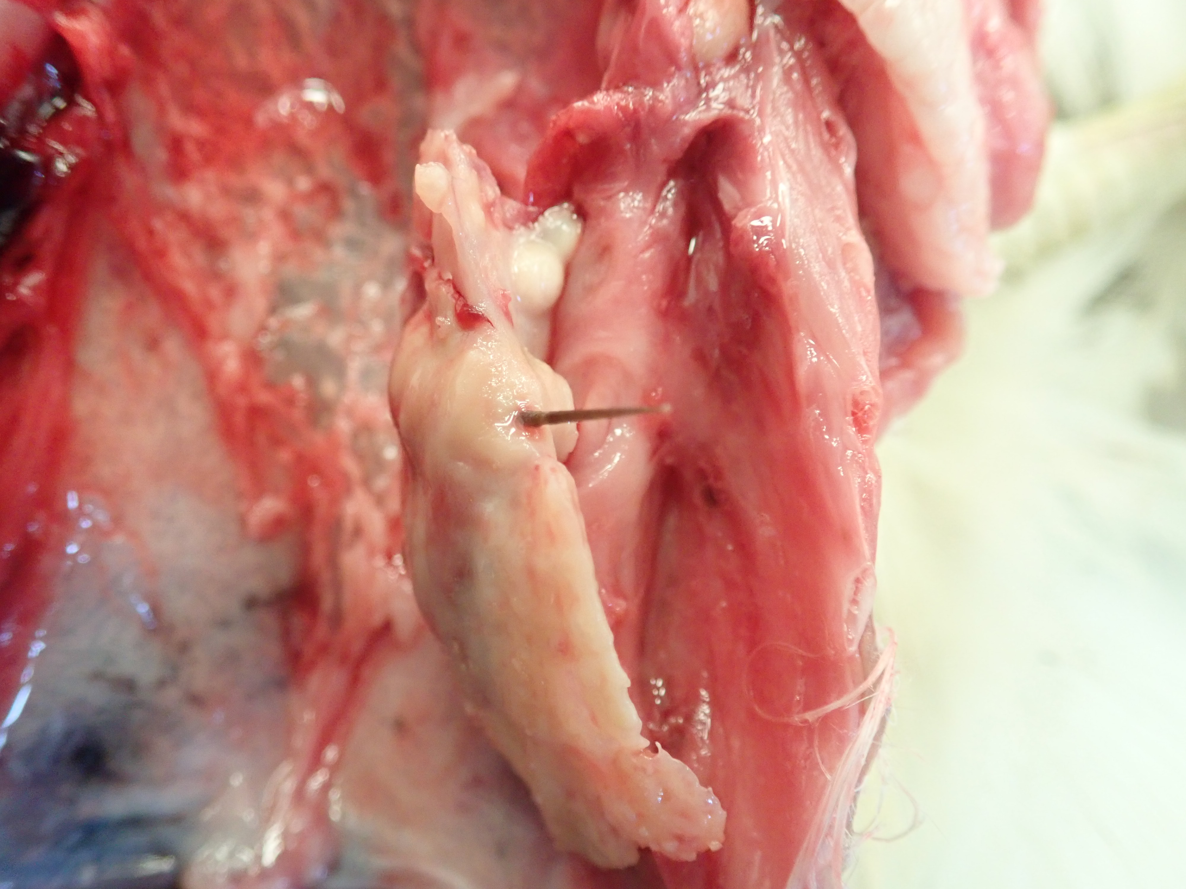 The hawk was submitted to the Cornell Wildlife Health Lab for necropsy (an animal version of an autopsy) to find out why it died. It was found to be in good body condition at the time of necropsy. However, when we opened it to examine its innards, we found five porcupine quills within the body cavity. They had become embedded in the hawk’s organs, and caused trauma and bleeding that resulted in expiration of the bird. Porcupine quills are often found in young, inexperienced or sick animals, since most healthy adults are too smart to go after a porcupine. It may have been an illness in this bird, such as a West Nile Virus infection, that led it to resort to scavenging a porcupine. Though the visible quills had been removed, quills are barbed on the end, and they can migrate within the body, causing morbidity or mortality at a later date. They do not show up on X-rays.