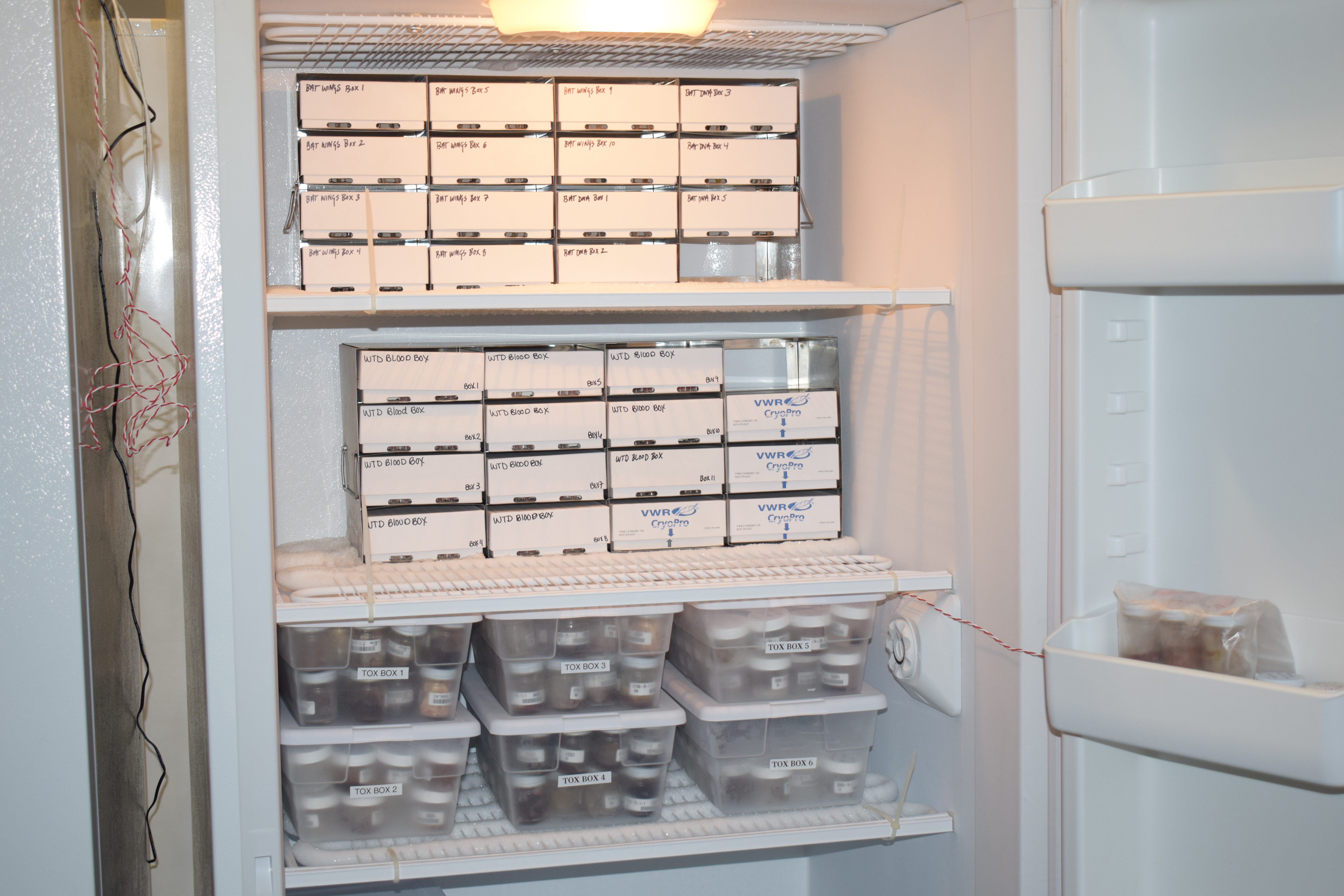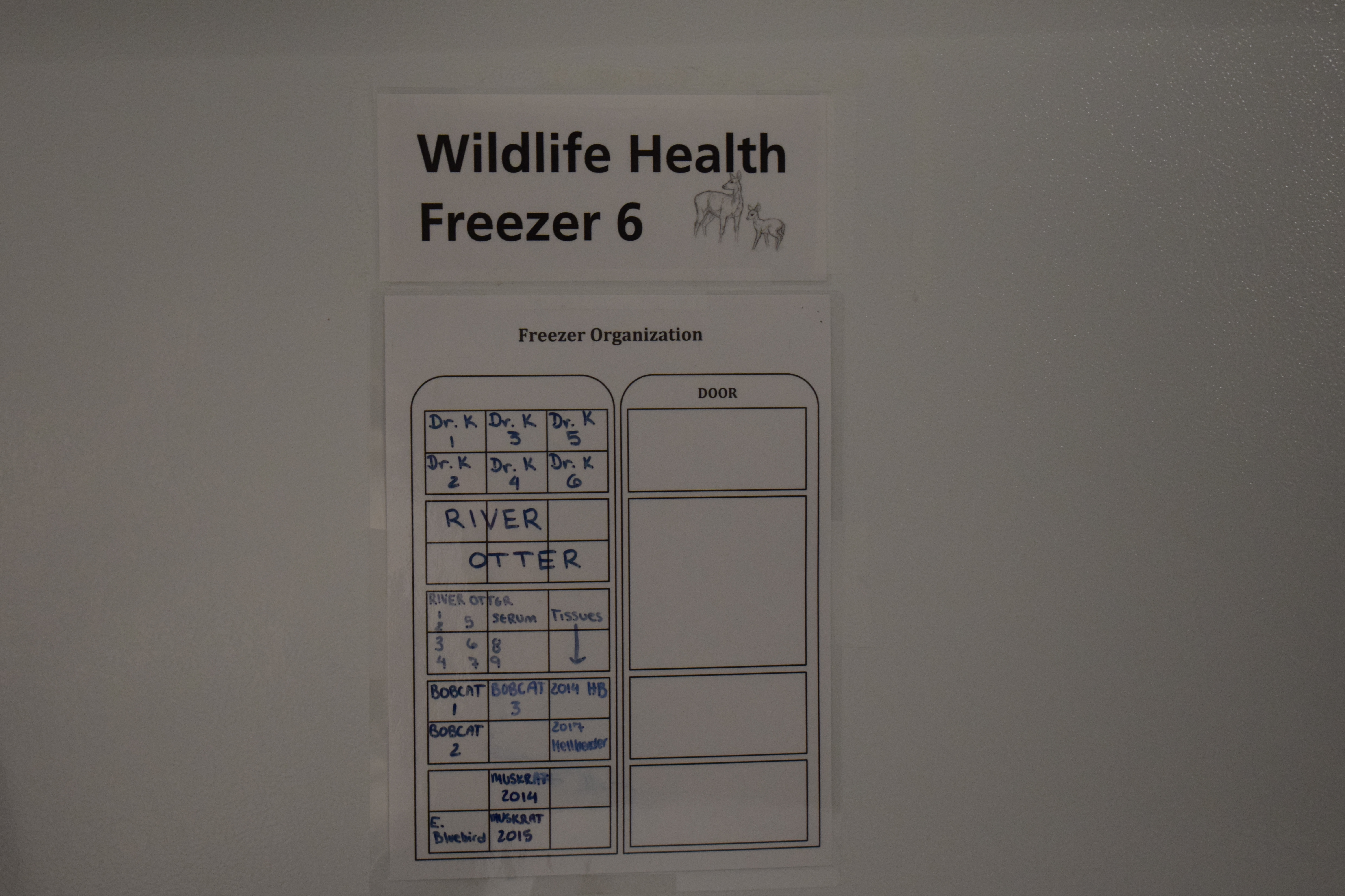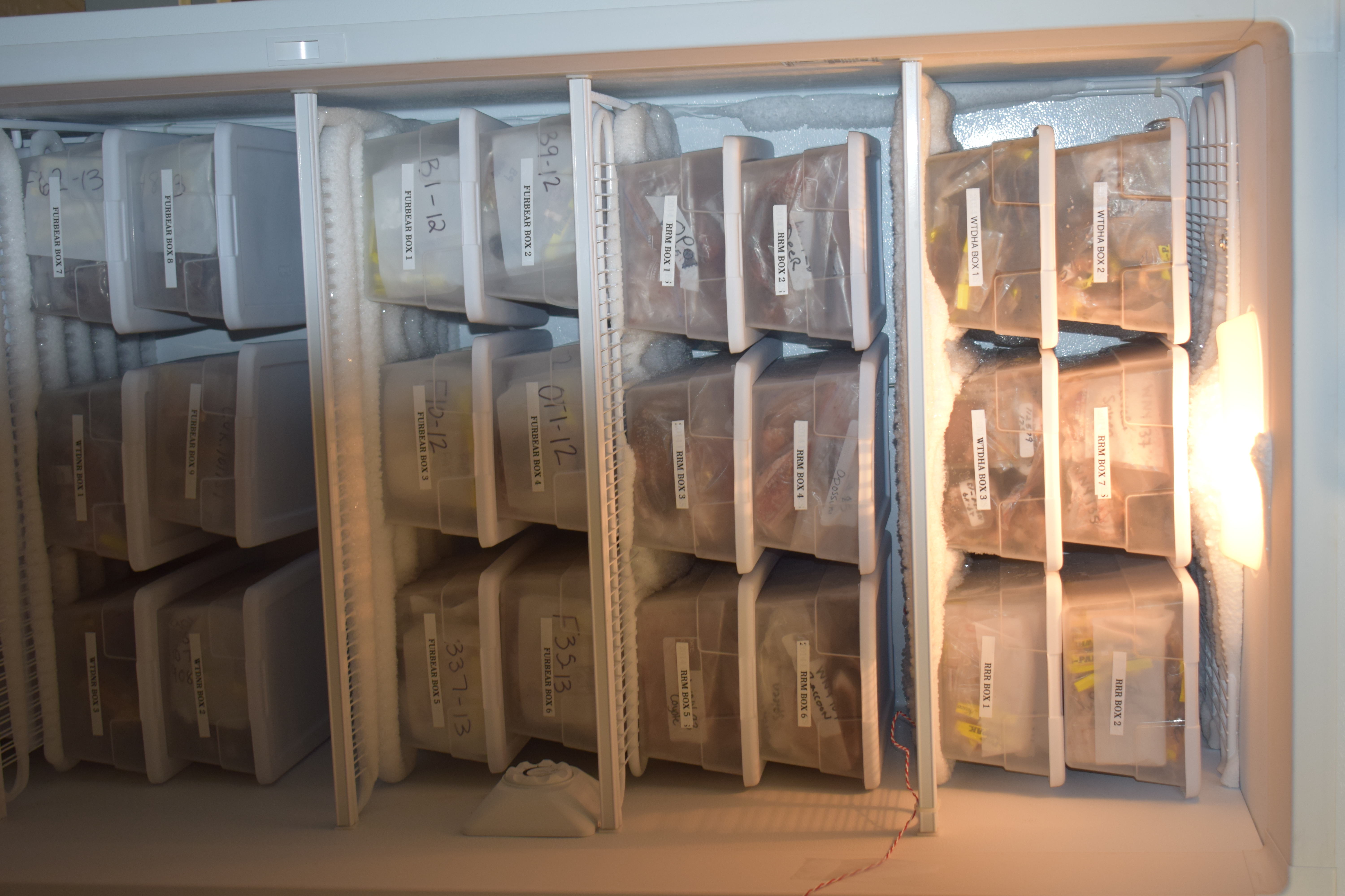 Most of us have forgotten bags of vegetables and mystery meat “stuffs” hanging out in our freezers. Here at the CWHL, we also have freezers full of strange things, but we won’t be using them for dinner anytime soon. When the New York State Wildlife Health Program (WHP) began in 2011, one of the top priorities was to bank (store) samples, like swabs, tissues, and blood, from wildlife cases to use for future disease investigation or research. Many of the animals examined by the WHP are not common or very hard to access (like bald eagles, porcupines, bobcats, rattlesnakes, and Eastern hellbenders). This makes it very important to take those opportunities to collect samples when anyone handles an animal in the field or one comes into the lab for necropsy (animal autopsy).
