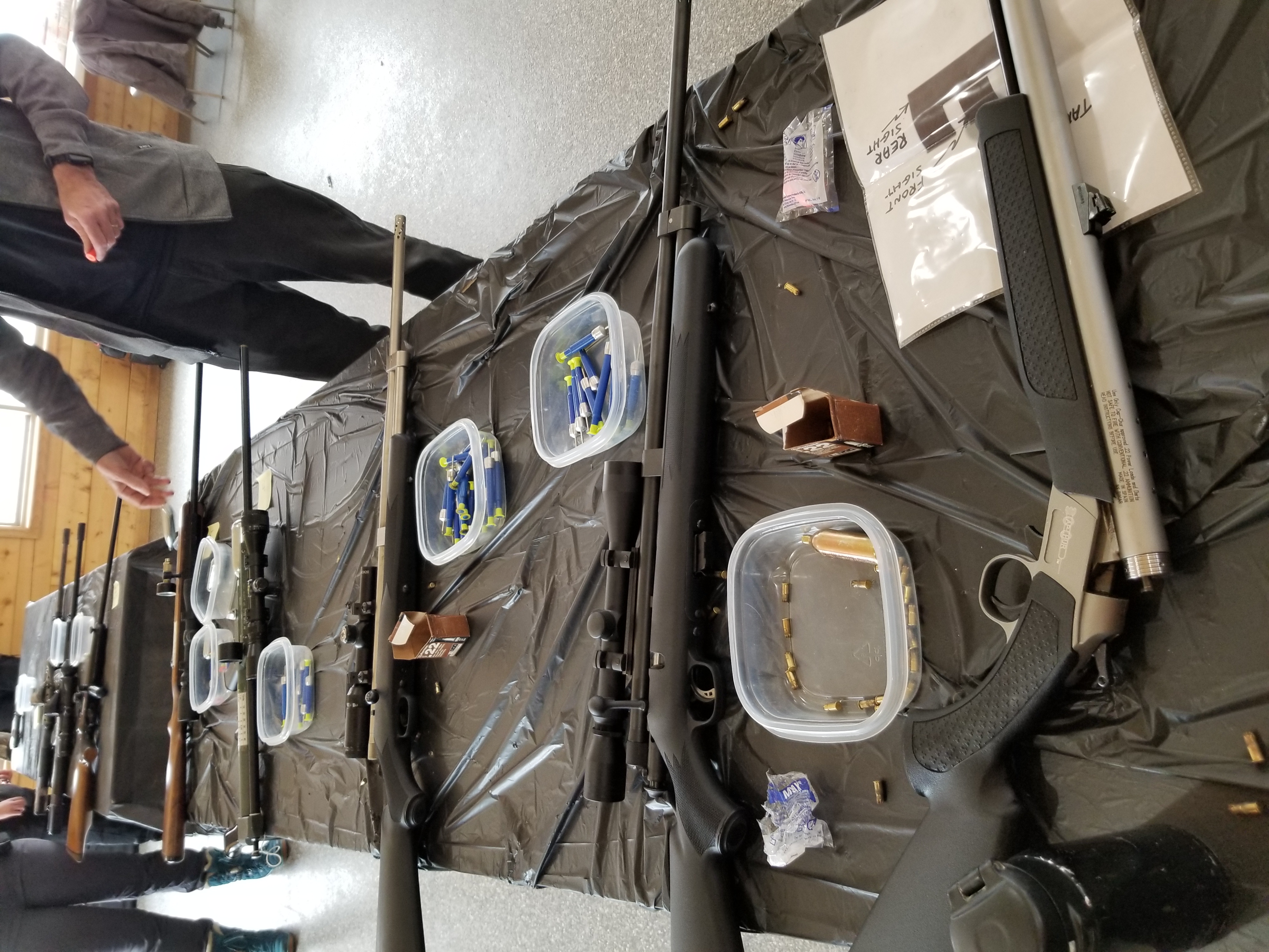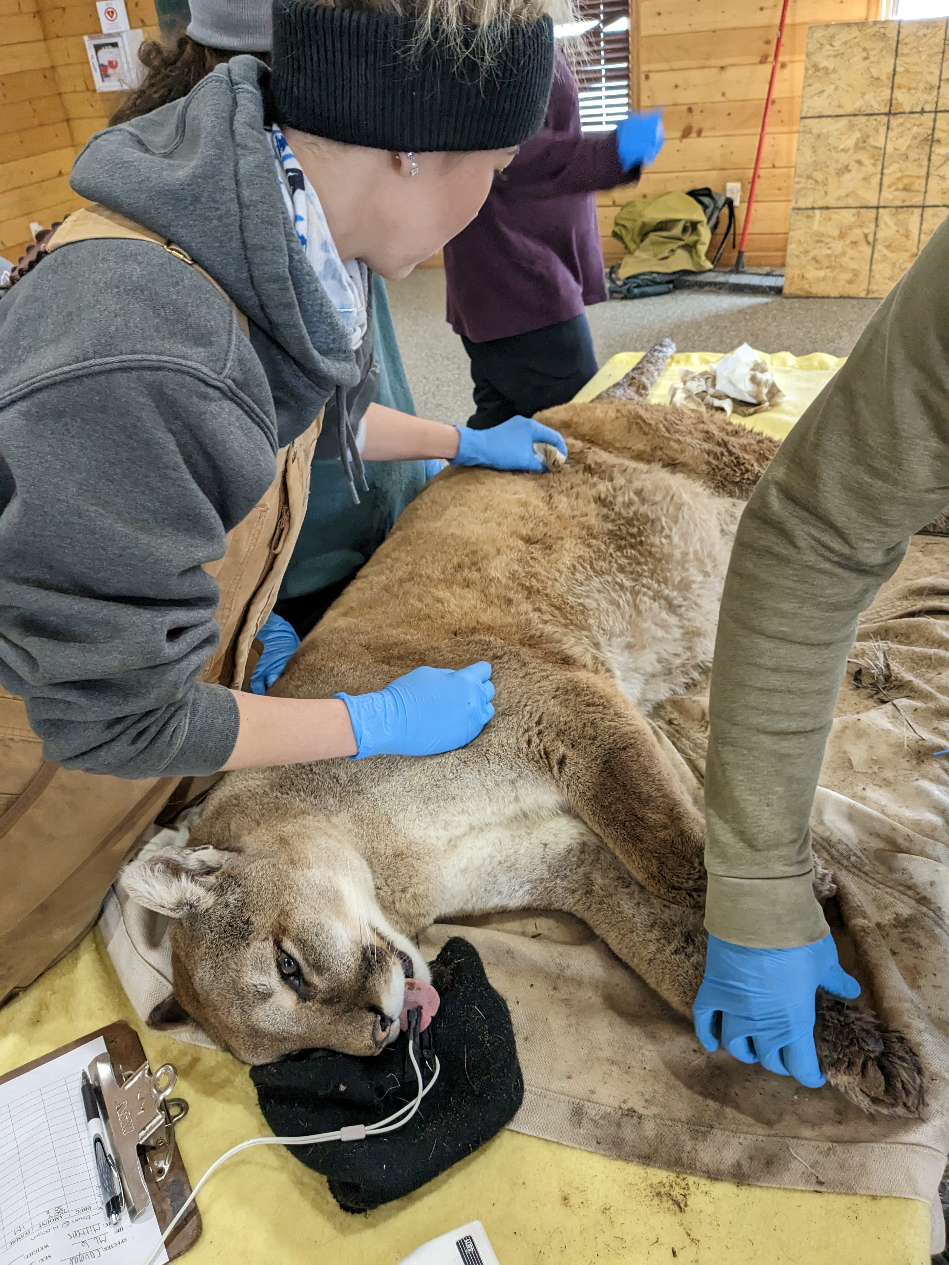 For our first lesson, the meeting room was set up as a gun range. We practiced loading and firing multiple types of dart guns, including pistols and rifles powered with either CO2, .22 caliber blanks, or compressed air. After picking our favorite equipment, it was time to work with the animals! Over the next four days, we anesthetized mountain lions, black bears, gray wolves, and bobcats. During anesthesia, all animals received a thorough physical examination, including weights and blood collection for health monitoring, and preventative medications (such as heartworm meds for the wolves). Day one focused on mountain lions. We anesthetized two individuals using drugs loaded into a syringe in a DAN-INJECT CO2 pistol. Once the animals were safe to handle, we carried them to a workstation and began monitoring temperature, pulse, and respiration (TPR). We also practiced collecting blood from common collection sites (saphenous and cephalic veins for mountain lions). When we finished, we reversed the effects of the anesthetic and carried the animals to their enclosure to wake up. Day one was a success!