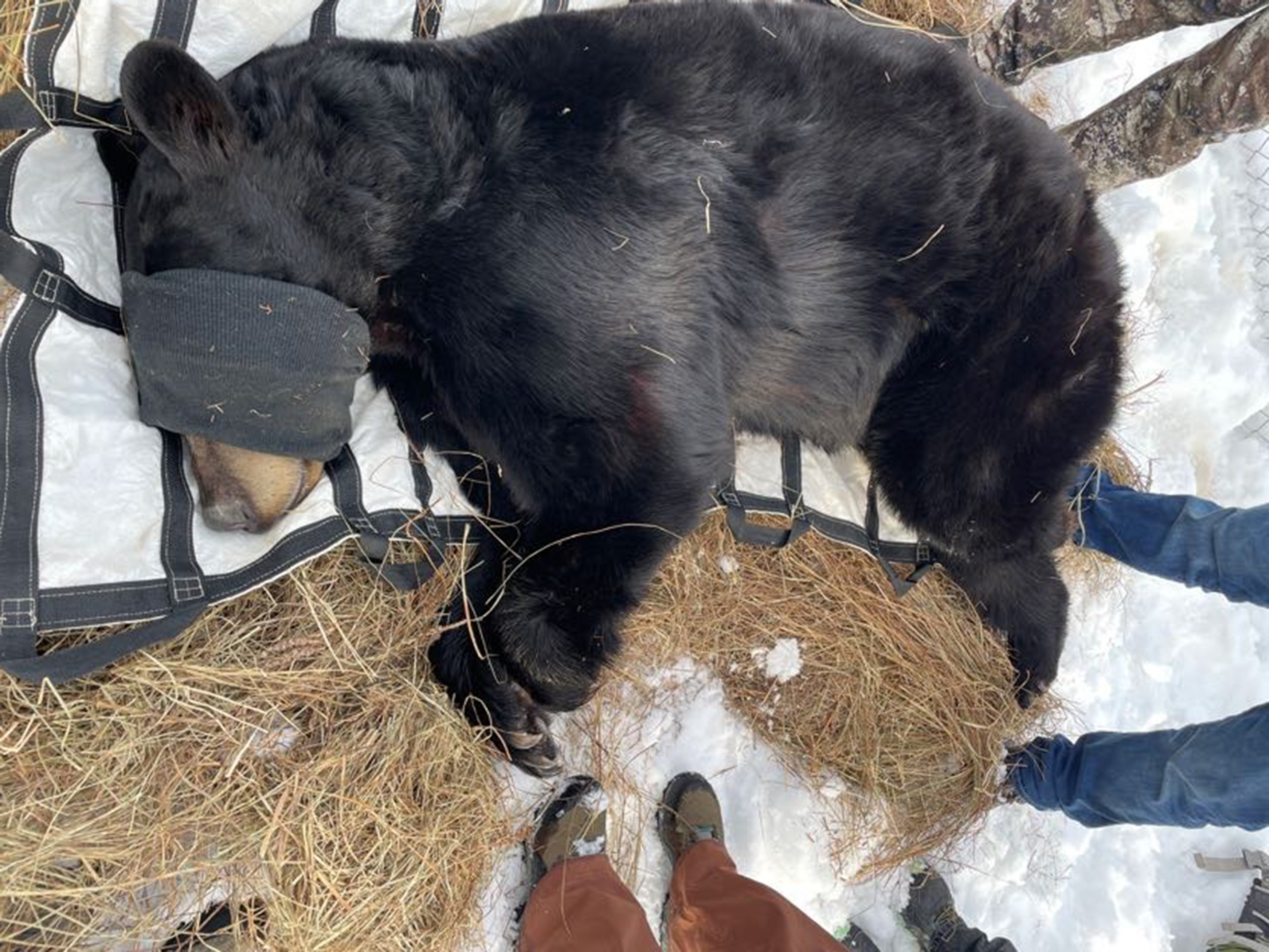 The next day, we worked with two black bears. The bears were hibernating in dens in their enclosures. Again, we used the DAN-INJECT CO2 pistol to inject anesthetics into each bear and worked with them right next to their dens. It was snowy and cold, but that’s how field research is in reality! Monitoring the bears’ TPR was very similar to the mountain lions, but our expectations for normal were adjusted because of hibernation. When animals hibernate, their body temperatures and heart rates decrease naturally. It is normal for hibernating bears to have temperatures in the low 90s Fahrenheit during anesthesia (in summer, they would be closer to 99°F). We practiced collecting blood from the femoral and cephalic veins as well as the tongue veins which may be needed in emergencies. Then the anesthetics were reversed, and the bears were returned to their dens to finish hibernating.