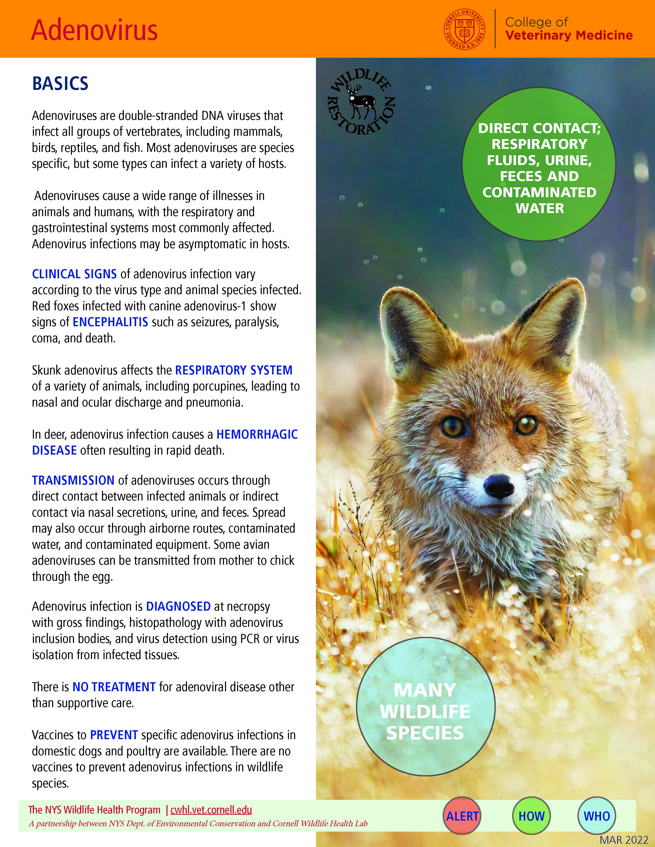 In deer, Odocoileus adenovirus (OdAdV) causes adenovirus hemorrhagic disease (AHD) often resulting in rapid death, especially in fawns. See the disease fact sheet on AHD for details.