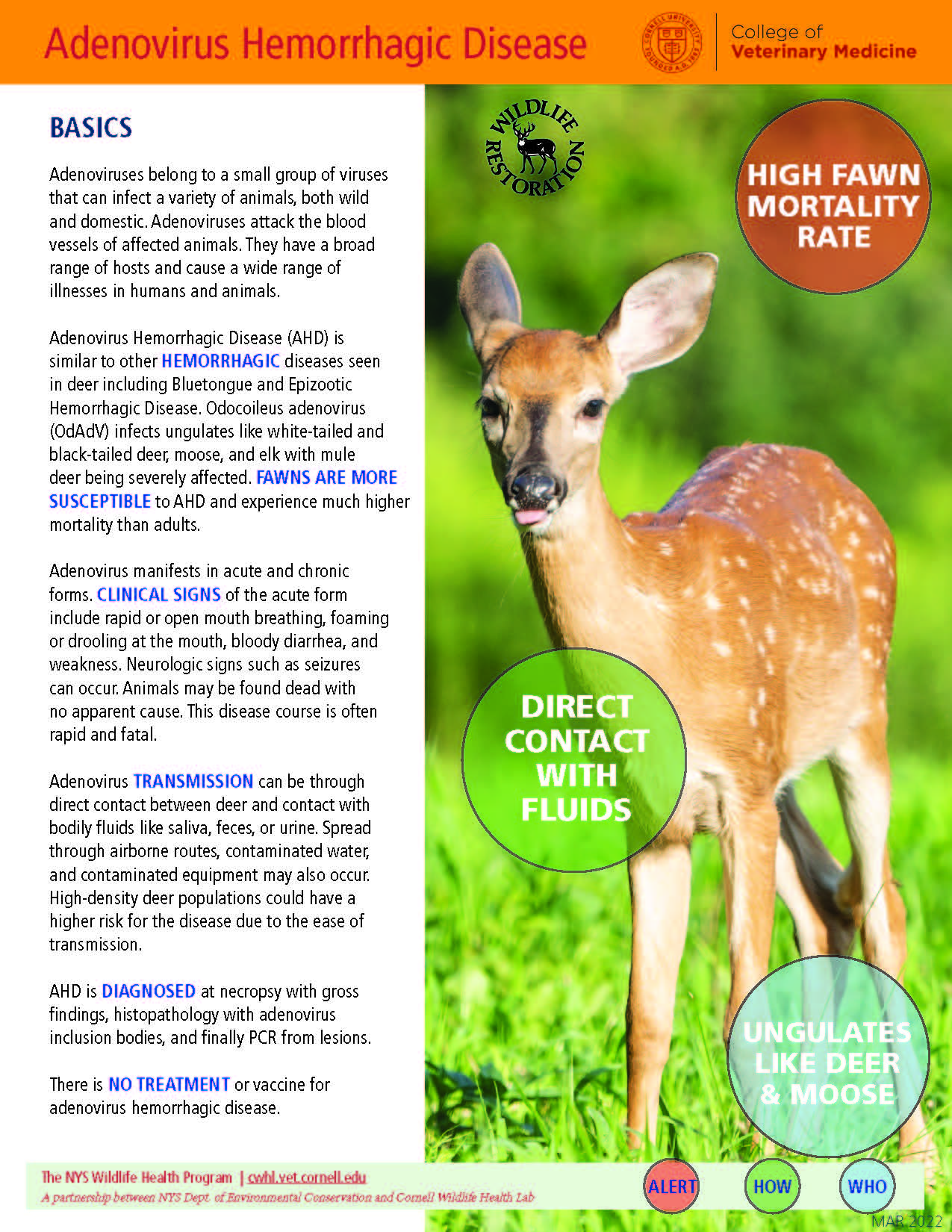 Adenovirus Hemorrhagic Disease (AHD) is similar to other hemorrhagic diseases seen in deer including Bluetongue and Epizootic Hemorrhagic Disease. Odocoileus adenovirus (OdAdV) infects ungulates like white-tailed and black-tailed deer, moose, and elk with mule deer being severely affected. Fawns are more susceptible to AHD and experience much higher mortality than adults.