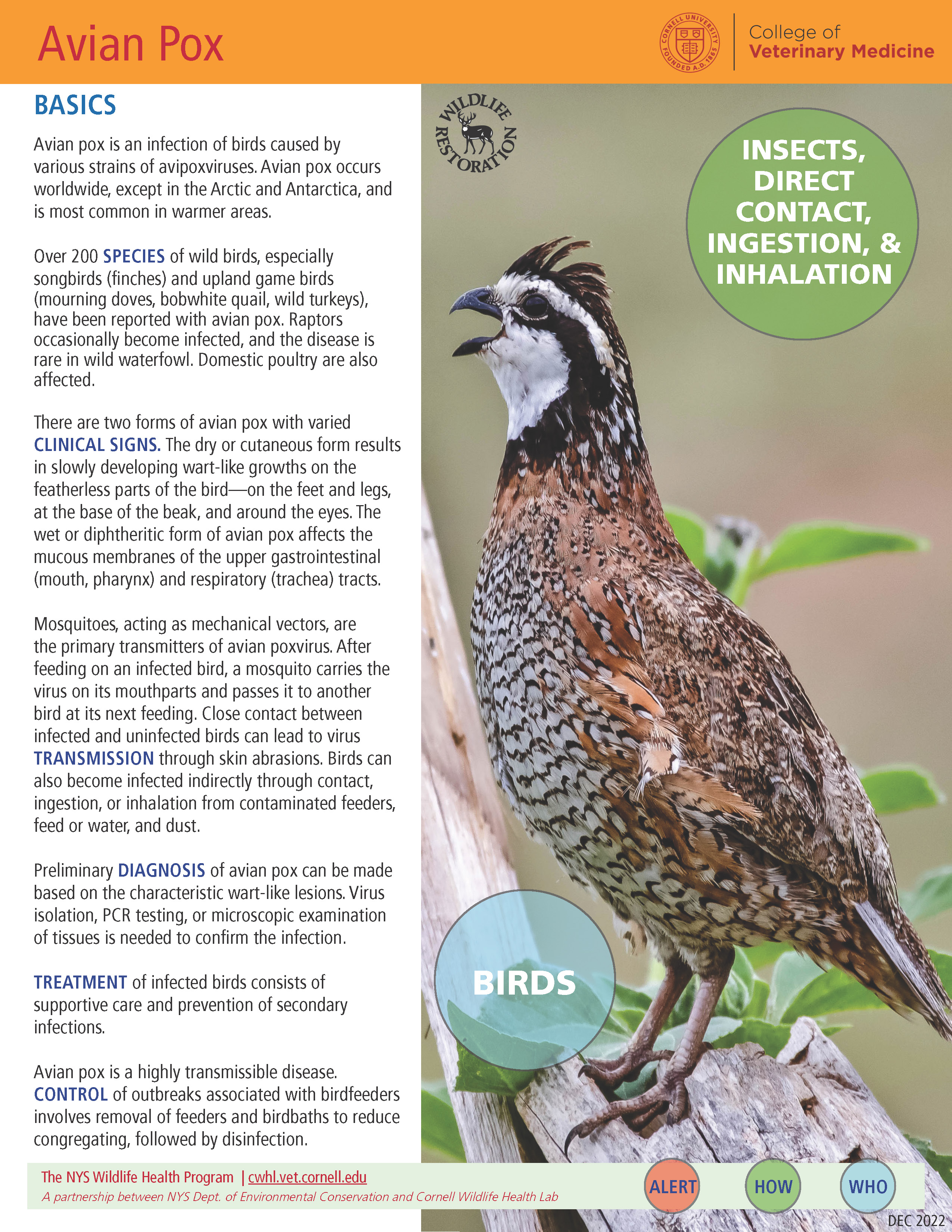 Avian pox is most common in warmer, humid areas with cases related to seasonal mosquito cycles. Mosquitoes can harbor the virus for more than a month and infect birds via biting.