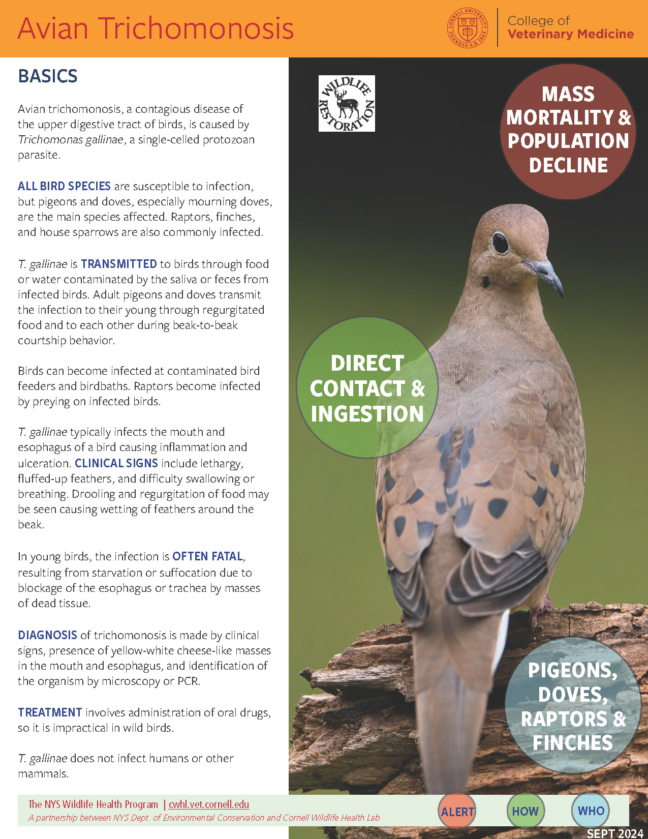 Trichomonosis is most frequent in late spring, summer, and fall as the parasite is passed from parent to offspring or through courtship behaviors.