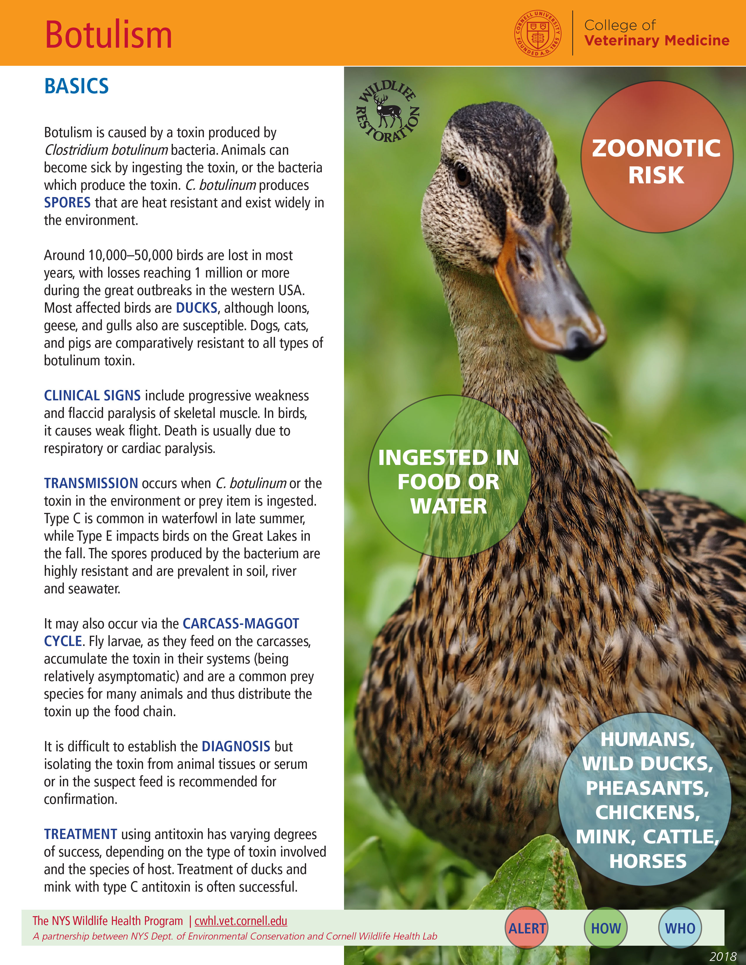 Botulism is caused by a toxin produced by Clostridium botulinum bacteria. Animals can become sick by ingesting the toxin or the bacteria which produce the toxin. C. botulinum produces spores that are heat resistant and exist widely in the environment.