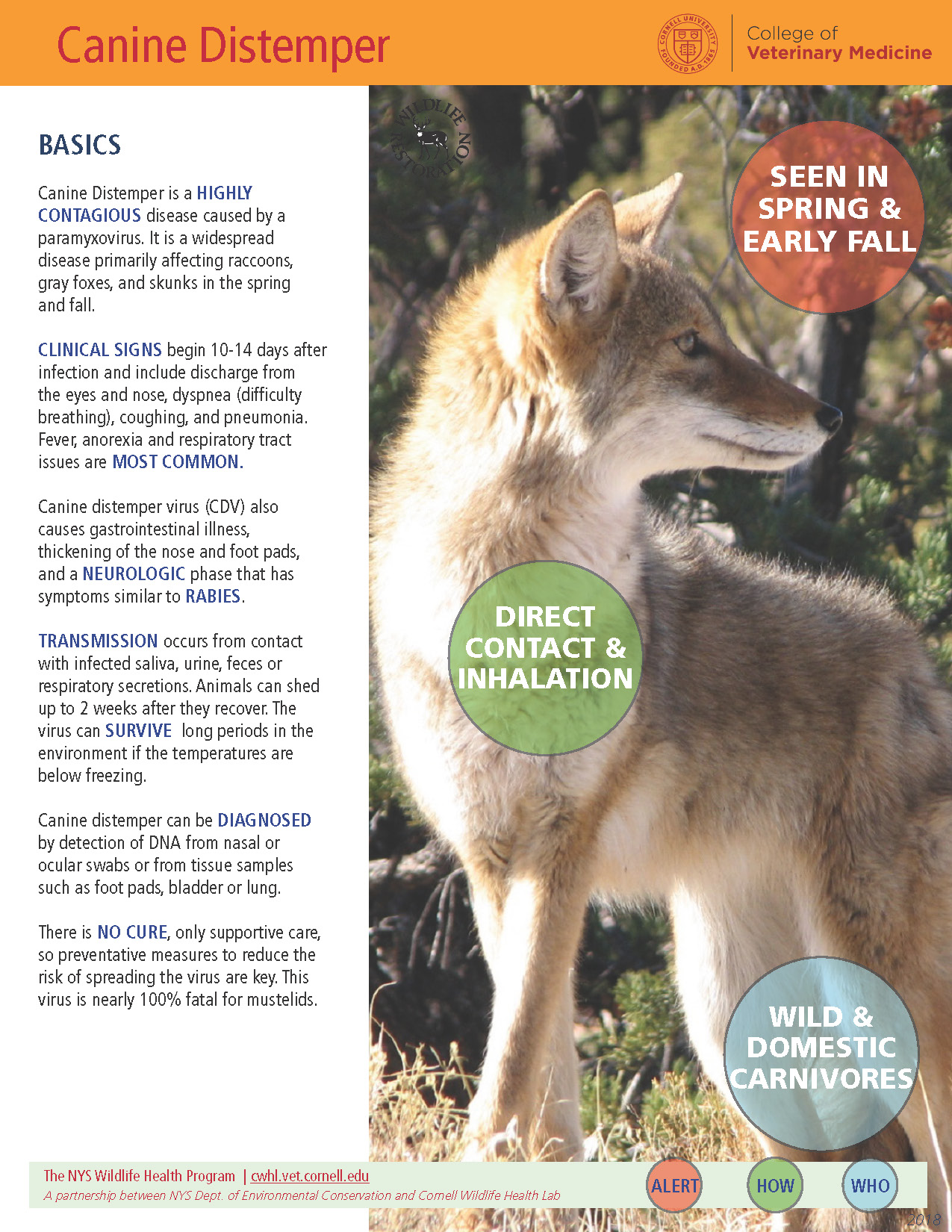 Canine Distemper is a highly contagious disease caused by a paramyxovirus. It is a widespread disease primarily affecting raccoons, gray foxes, and skunks in the spring and fall.