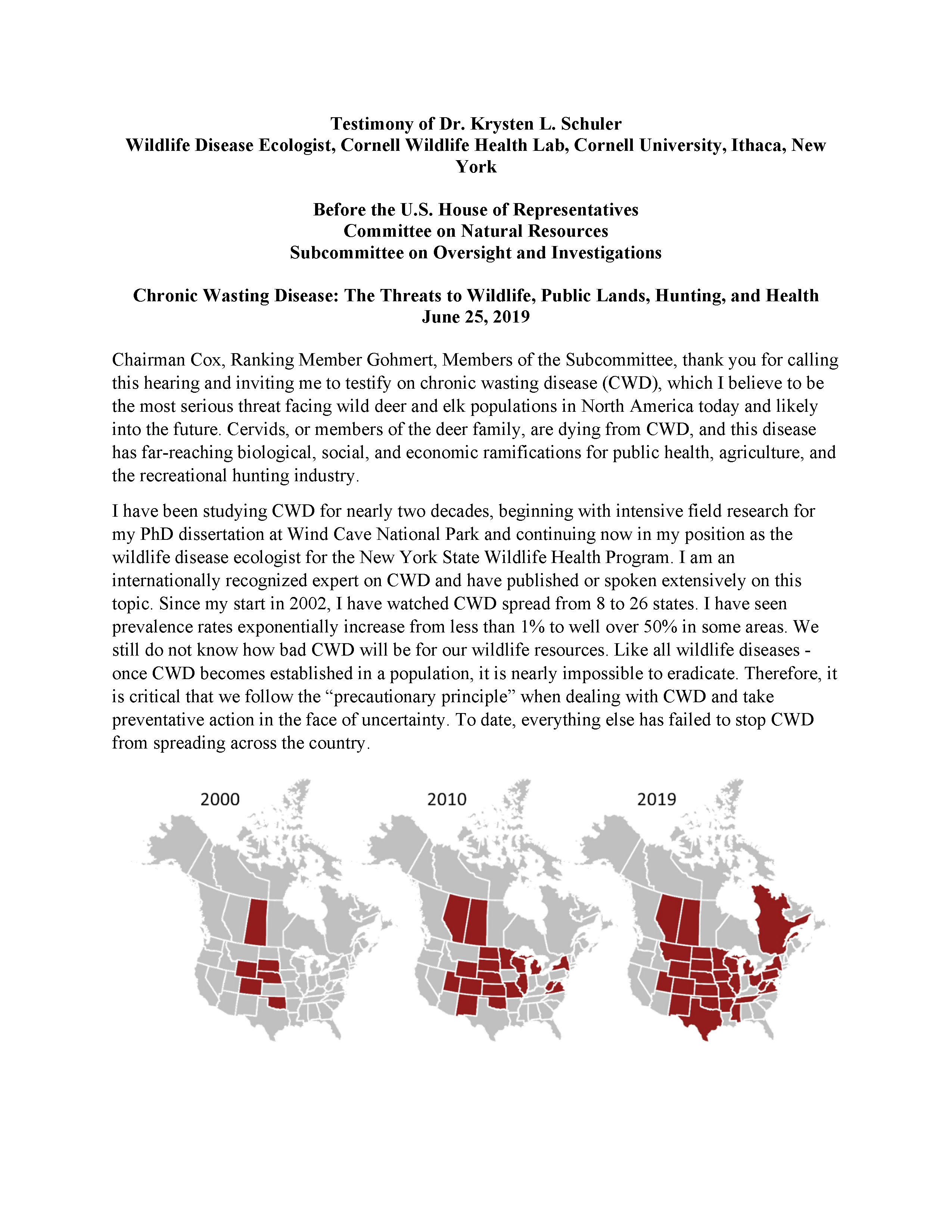 Chairman Cox, Ranking Member Gohmert, Members of the Subcommittee, thank you for calling this hearing and inviting me to testify on chronic wasting disease (CWD), which I believe to be the most serious threat facing wild deer and elk populations in North America today and likely into the future. Cervids, or members of the deer family, are dying from CWD, and this disease has far-reaching biological, social, and economic ramifications for public health, agriculture, and the recreational hunting industry.