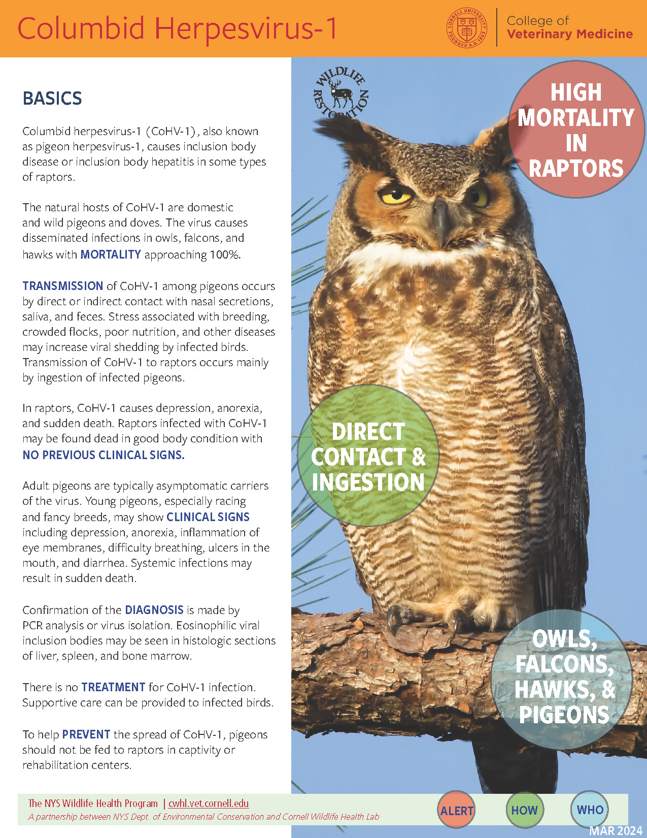 The virus causes disease in a variety of birds of prey, including great horned owl, barking owl, powerful owl, prairie falcon, American kestrel, peregrine falcon, and Cooper’s hawk. Although the virus can cause persistent mortality in urban great horned owls, it does not impact populations of raptors.