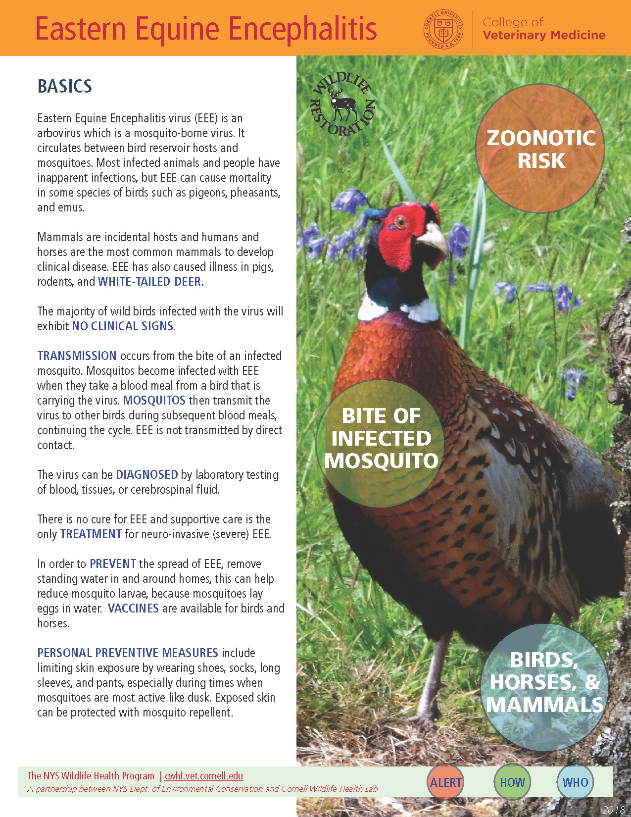 Eastern Equine Encephalitis virus (EEE) is an arbovirus which is a mosquito-borne virus. It circulates between bird reservoir hosts and mosquitoes. Most infected animals and people have inapparent infections, but EEE can cause mortality in some species of birds such as pigeons, pheasants, and emus.