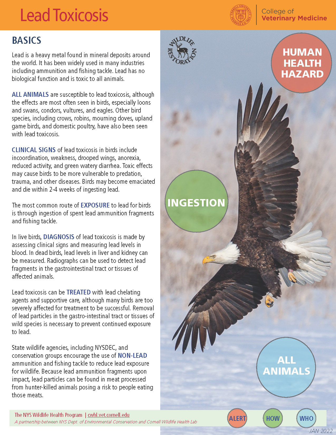 State wildlife agencies, including NYSDEC, and conservation groups encourage the use of non-lead ammunition and fishing tackle to reduce lead exposure for wildlife. Because lead ammunition fragments upon impact, lead particles can be found in meat processed from hunter-killed animals posing a risk to people eating those meats.