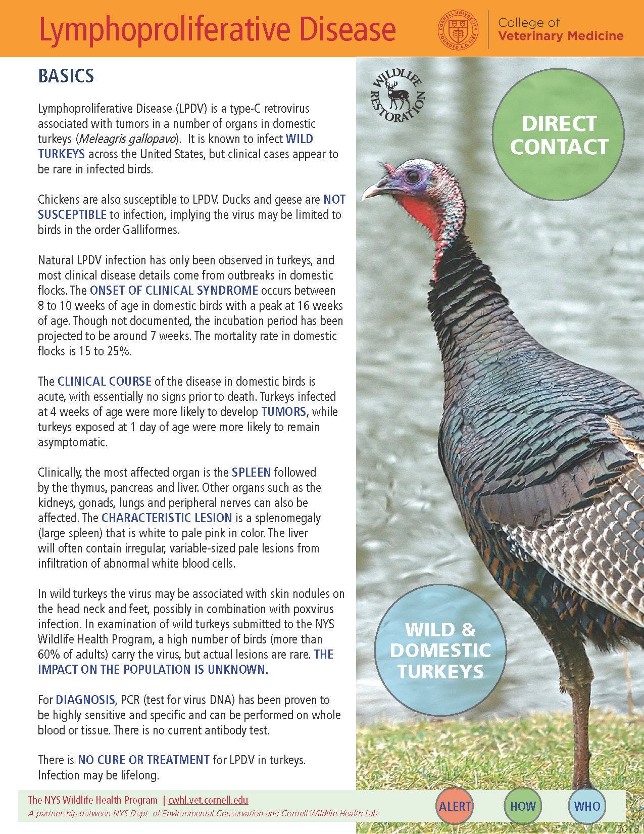 Lymphoproliferative Disease (LPDV) is a type-C retrovirus associated with tumors in a number of organs in domestic turkeys (Meleagris gallopavo). It is known to infect wild turkeys across the United States, but clinical cases appear to be rare in infected birds.
