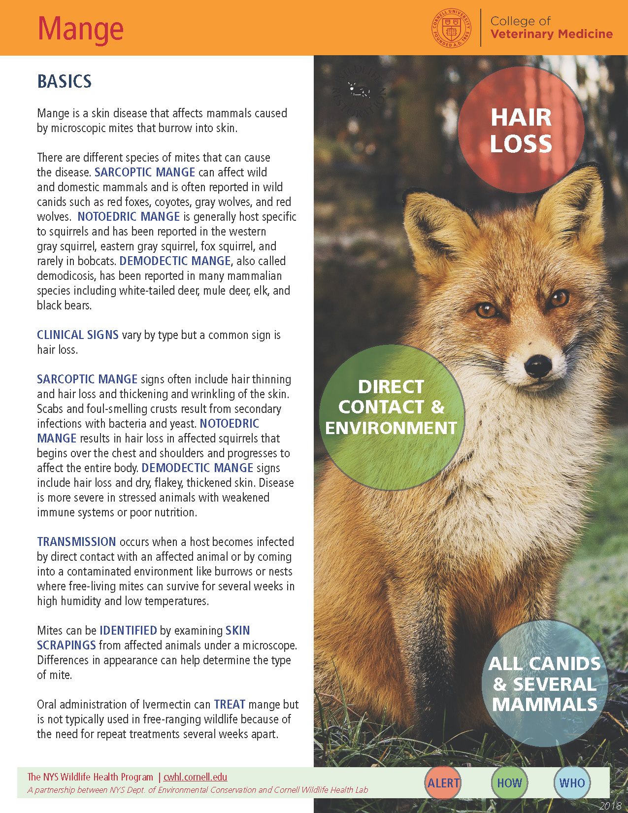 There are different species of mites that can cause the disease. Sarcoptic mange can affect wild and domestic mammals and is often reported in wild canids such as red foxes, coyotes, gray wolves, and red wolves. Notoedric mange is generally host-specific to squirrels and has been reported in the western gray squirrel, eastern gray squirrel, fox squirrel, and rarely in bobcats. Demodectic mange, also called demodicosis, has been reported in many mammalian species, including white-tailed deer, mule deer, elk, and black bears.
