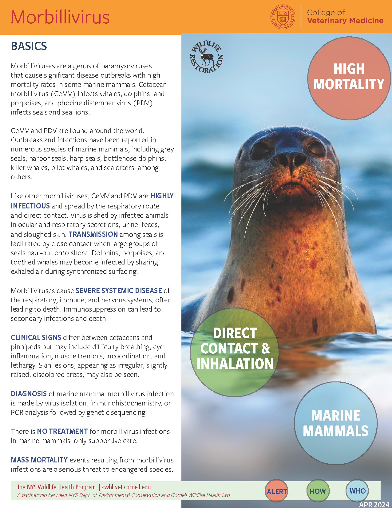Morbilliviruses are a genus of paramyxoviruses that cause significant disease outbreaks with high mortality rates in some marine mammals. Cetacean morbillivirus (CeMV) infects whales, dolphins, and porpoises, and phocine distemper virus (PDV) infects seals and sea lions.