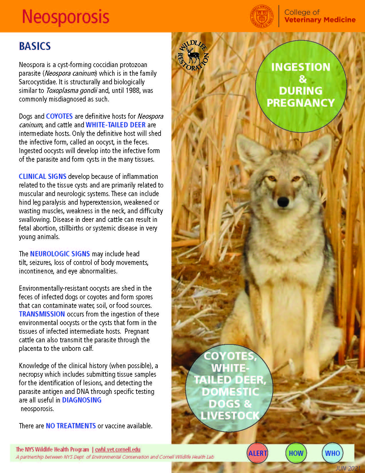 Dogs and coyotes are definitive hosts for Neospora caninum, and cattle and white-tailed deer are intermediate hosts. Only the definitive host will shed the infective form, called an oocyst, in the feces. Ingested oocysts will develop into the infective form of the parasite and form cysts in the many tissues.