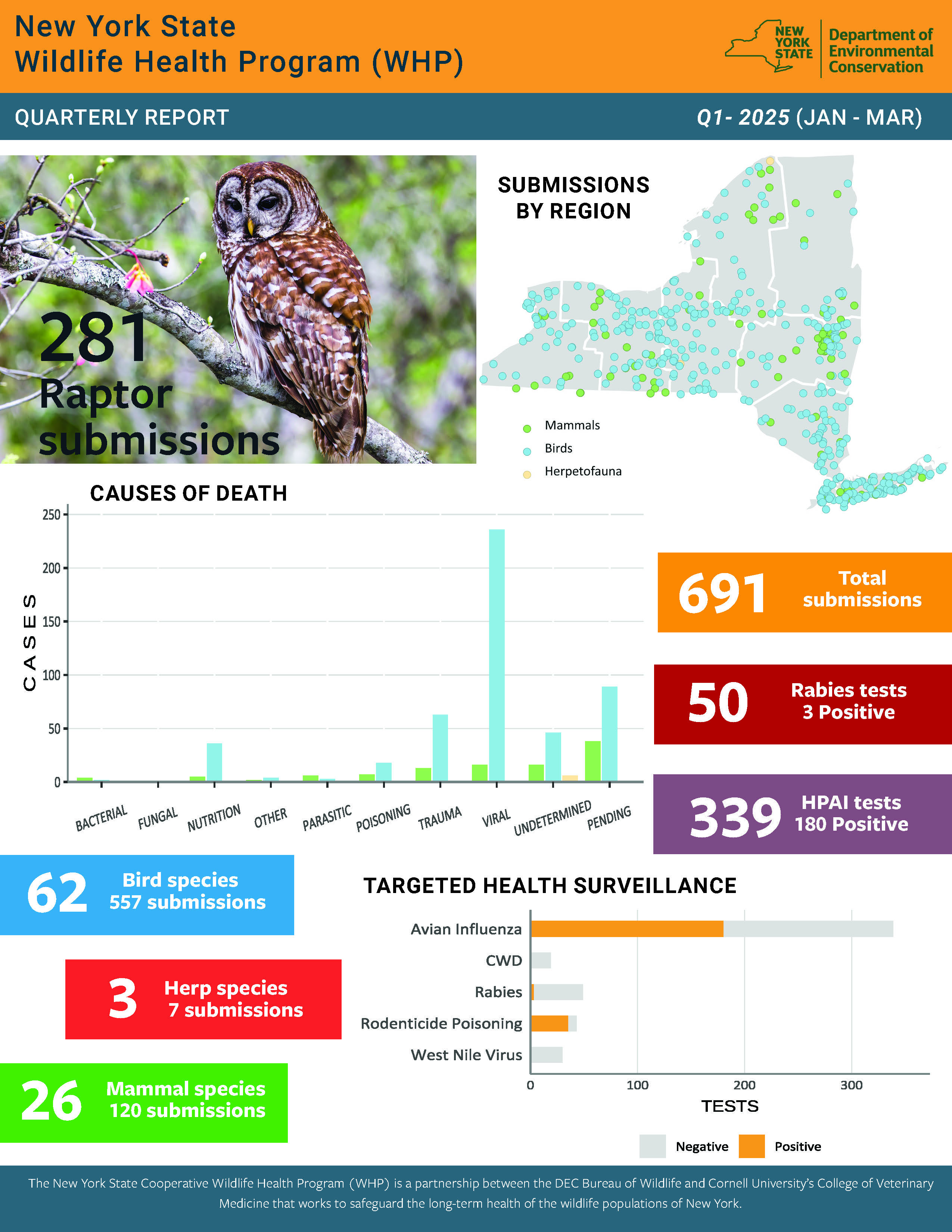 whp-newsletter-q1-2025_jlp.pdf 1.36 MB Resource Details Title: NYS WHP Quarterly Report Q1 2025Author: Jennifer PeasleeJennifer PeasleePublication date: 2025-04-21Source: NYS Wildlife Health ProgramStaff involved: Krysten Schuler, Jennifer Peaslee, Nicholas HollingsheadCitation: Jennifer Peaslee. (2025). NYS WHP Quarterly Report Q1 2025. NYS Wildlife Health Program. https://cwhl.vet.cornell.edu/resource/nys-whp-quarterly-report-q1-2025. Accessed Date: January 23, 2026.