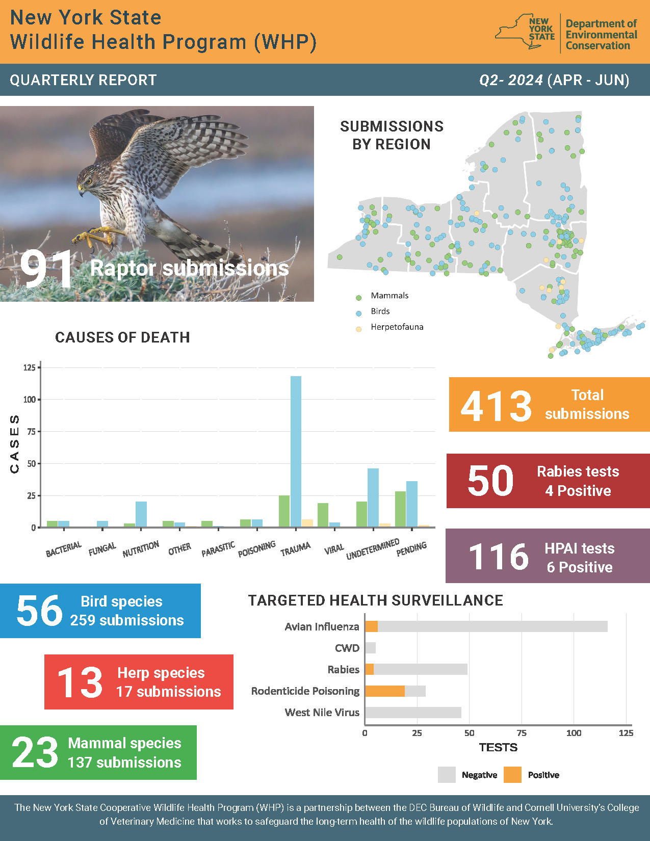whp-newsletter-q2-2024_jlp.pdf 1.24 MB Resource Details Title: NYS WHP Quarterly Report Q2 2024Author: Jennifer PeasleeJennifer PeasleePublication date: 2024-07-17Source: NYS Wildlife Health ProgramStaff involved: Krysten Schuler, Jennifer Peaslee, Nicholas HollingsheadCitation: Jennifer Peaslee. (2024). NYS WHP Quarterly Report Q2 2024. NYS Wildlife Health Program. https://cwhl.vet.cornell.edu/resource/nys-whp-quarterly-report-q2-2024. Accessed Date: January 23, 2026.