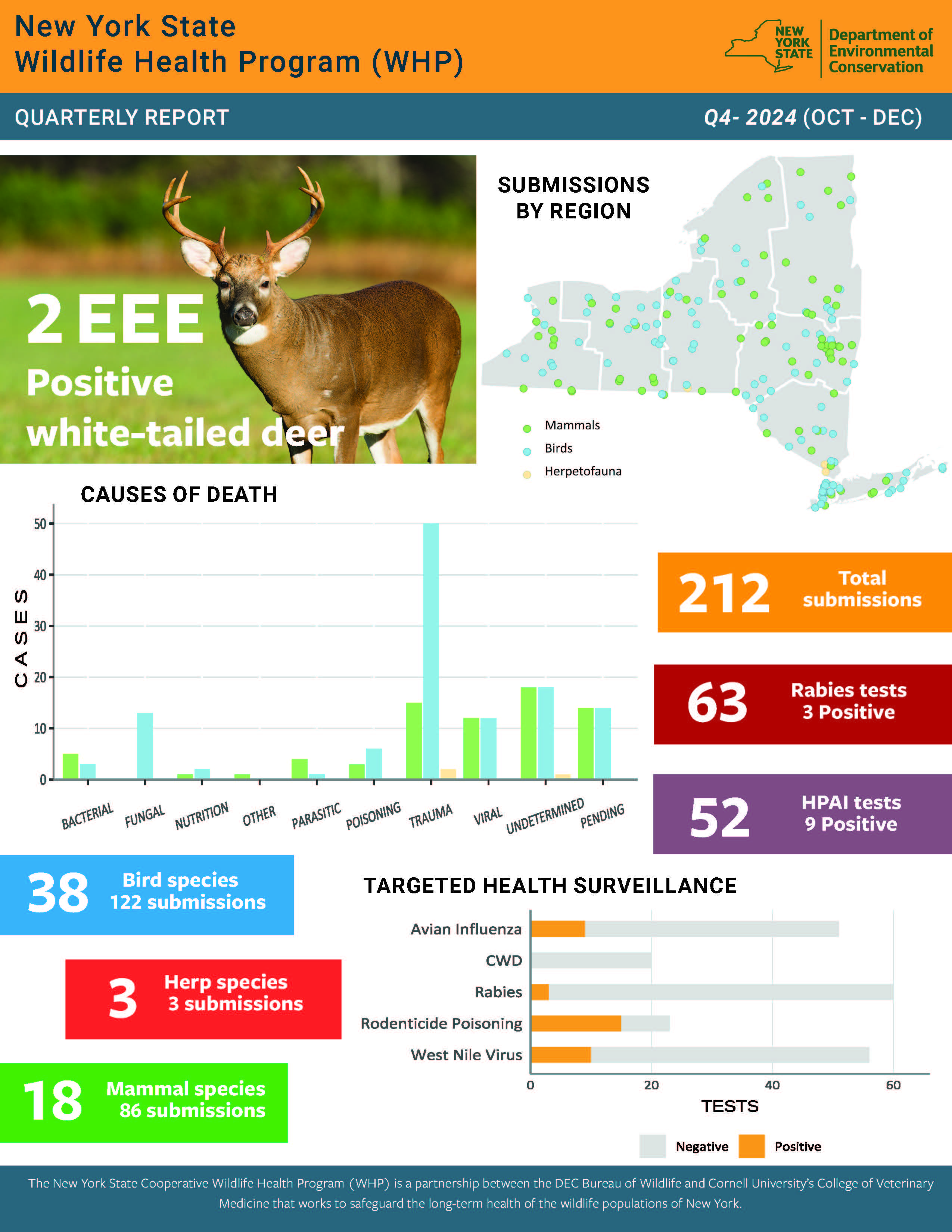 whp-newsletter-q4-2024_jlp.pdf 879.03 KB Resource Details Title: NYS WHP Quarterly Report Q4 2024Author: Jennifer PeasleeJennifer PeasleePublication date: 2025-01-16Source: NYS Wildlife Health ProgramStaff involved: Krysten Schuler, Jennifer Peaslee, Nicholas HollingsheadCitation: Jennifer Peaslee. (2025). NYS WHP Quarterly Report Q4 2024. NYS Wildlife Health Program. https://cwhl.vet.cornell.edu/resource/nys-whp-quarterly-report-q4-2024. Accessed Date: January 23, 2026.