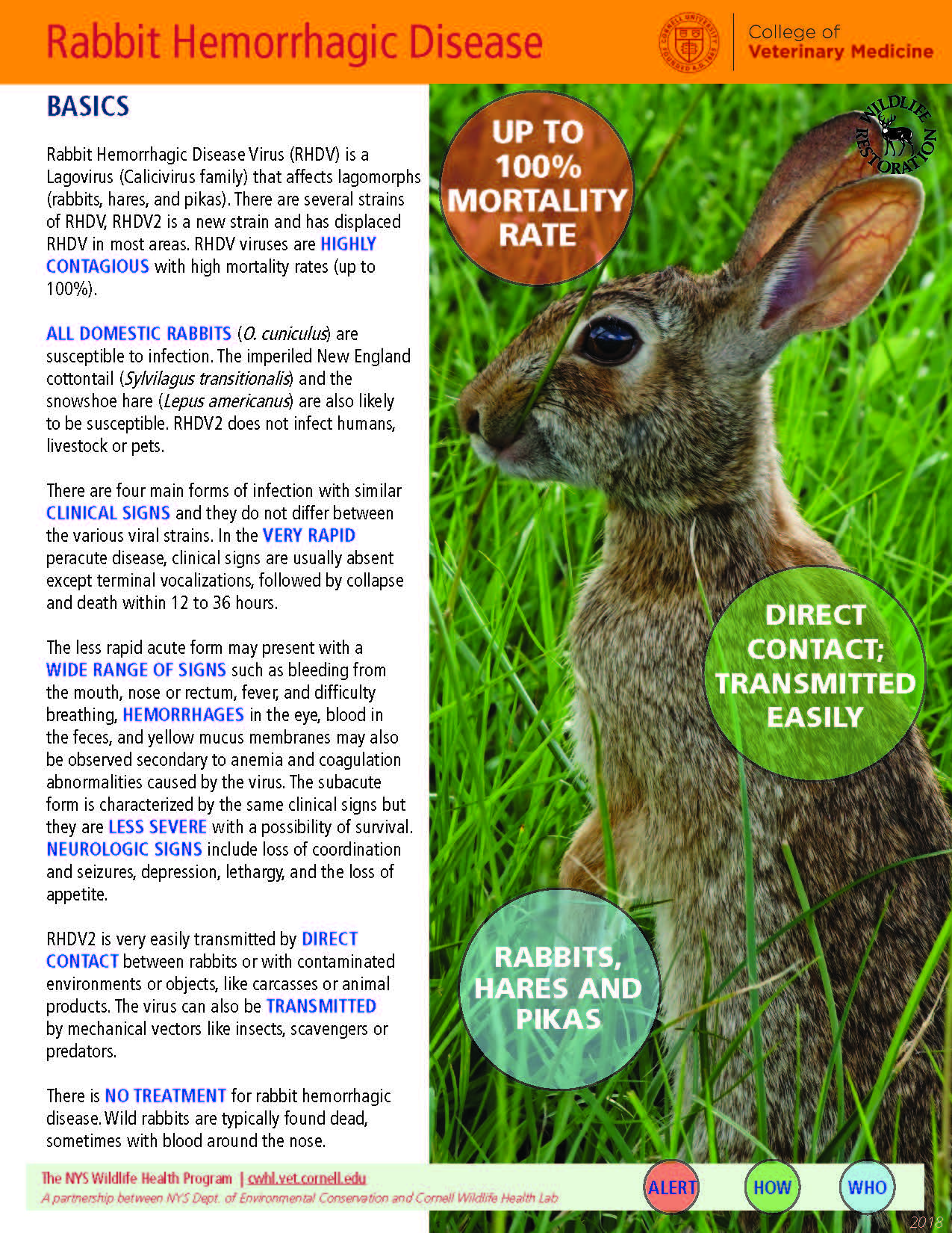 RHDV2 is currently not known to exist in NY rabbit populations. Please do not move domestic rabbits from other states or rabbit products to contain the virus. If you have been to an affected state, disinfect potentially contaminated clothing and footwear.