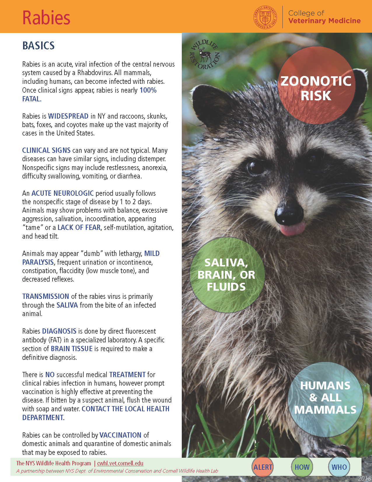 Since about 1990, raccoons have had the most rabies cases of all wildlife species in New York State. Rabies does not infect birds or reptiles.