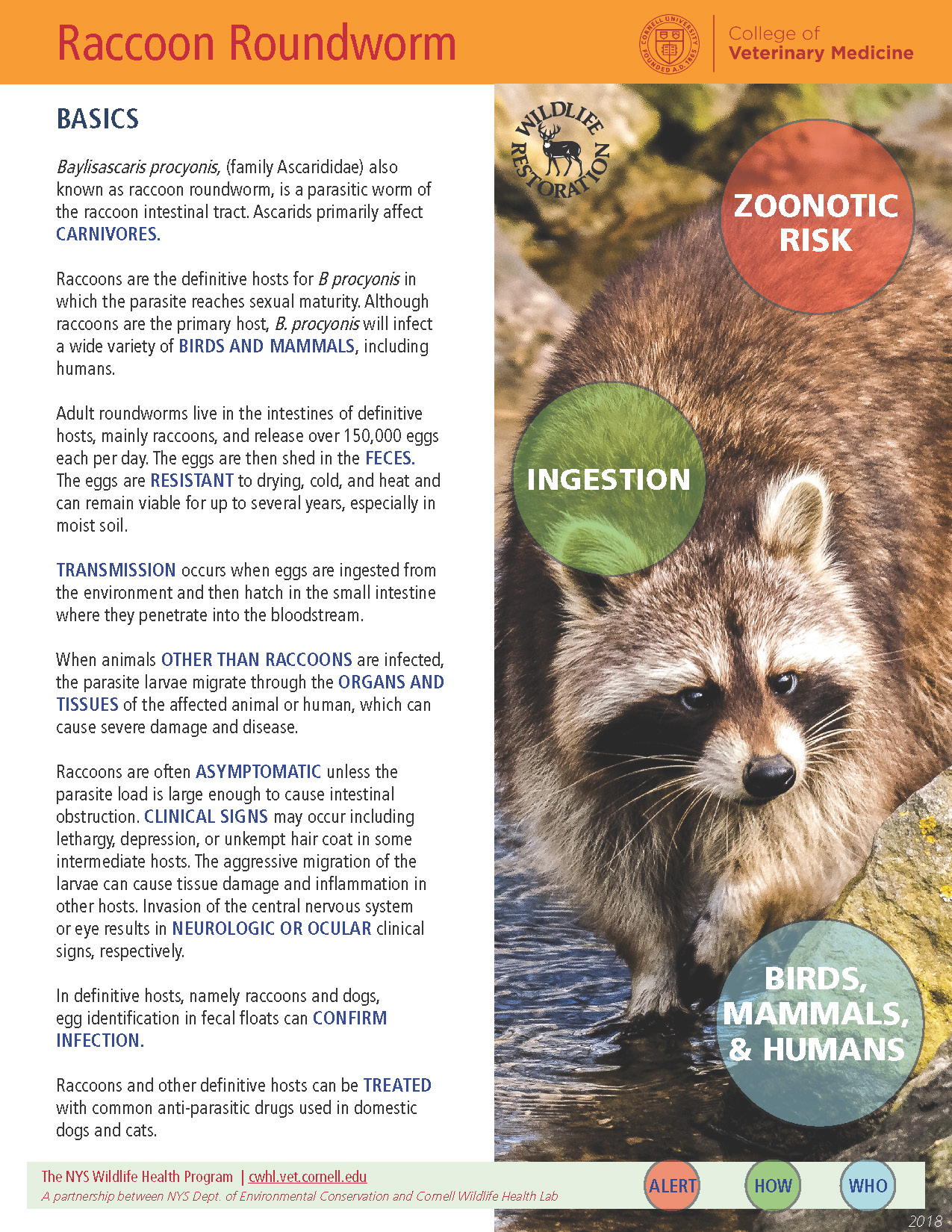 Adult roundworms live in the intestines of definitive hosts, mainly raccoons, and release over 150,000 eggs each per day. The eggs are then shed in the feces. The eggs are resistant to drying, cold, and heat and can remain viable for up to several years, especially in moist soil.