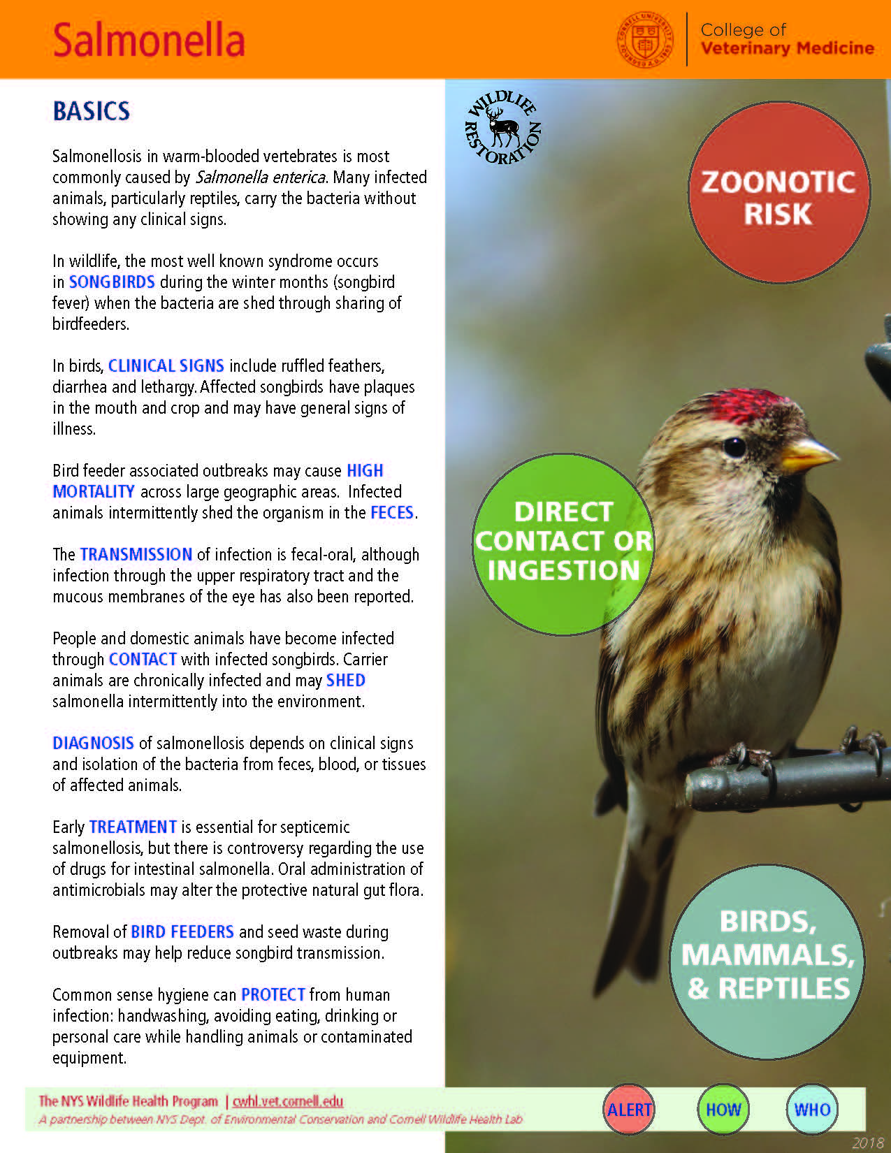 People and domestic animals have become infected through contact with infected songbirds. Carrier animals are chronically infected and may shed salmonella intermittently into the environment.