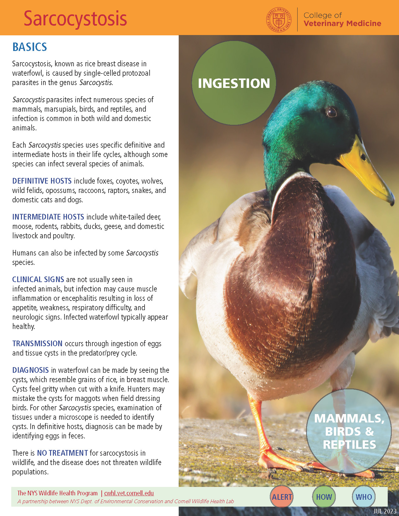 Sarcocystosis, known as rice breast disease in waterfowl, is caused by single-celled protozoal parasites in the genus Sarcocystis.